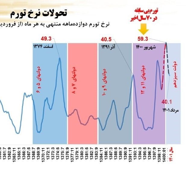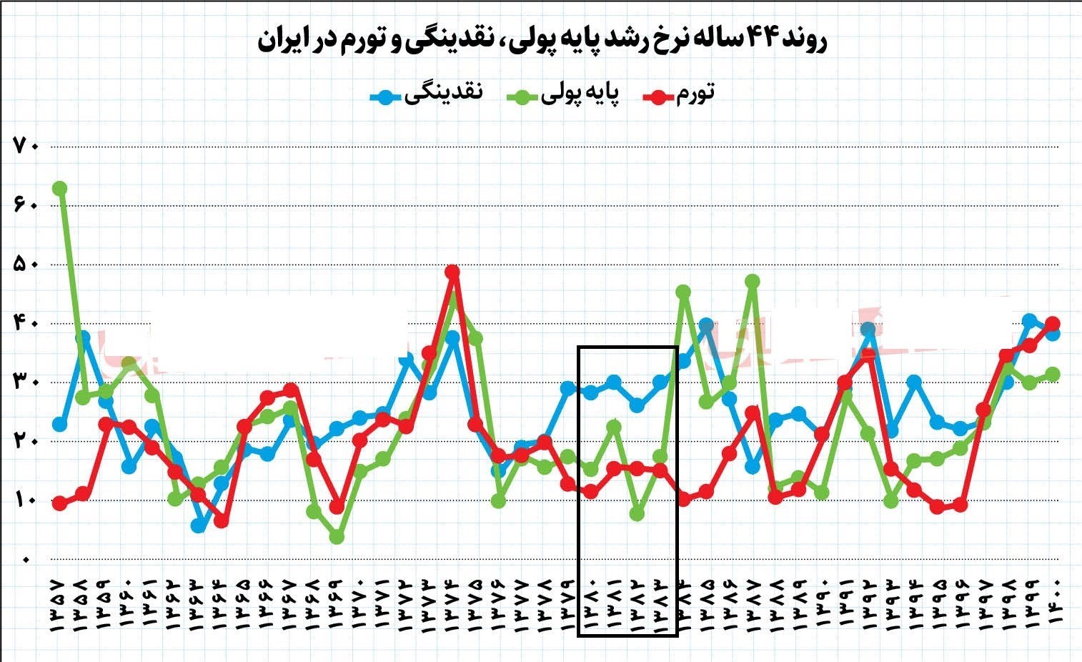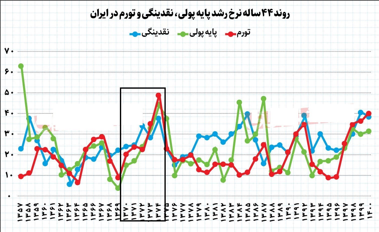 همانطور که در نمودار زیر مشخص است (قسمت بنفش)، بهواسطه افزایش نرخ ارز رسمی نرخ تورم از سال ۱۳۹۷ در روندی صعودی قرار گرفت و تا پایان ۱۴۰۰ رکورد تورم اقتصاد ایران زده شد و از طرفی نرخ ارز نیز هیچگاه تکنرخی نشد.