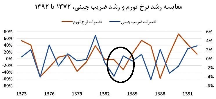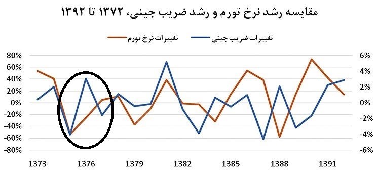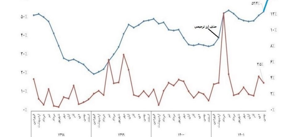 همانطور که در نمودار زیر مشخص است، روند نزولی تورم پس از حذف ارز ترجیحی و اجرای سیاست تکنرخسازی ارز صعودی شده است (نمودار قرمزرنگ نرخ تورم ماهانه و نمودار آبیرنگ نرخ تورم نقطه به نقطه است)؛