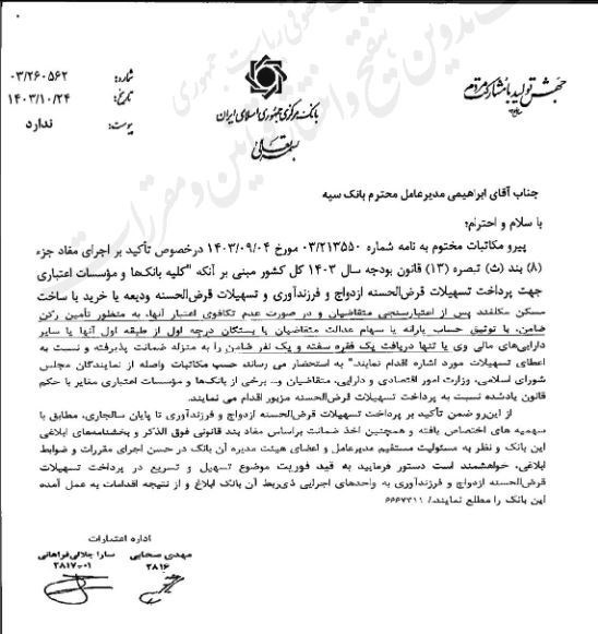 از این رو ضمن ضمن تأکید بر پرداخت تسهیلات قرض الحسنه ازدواج و فرزند اوری تا پایان سالجاری، مطابق با سهمیه های اختصاص یافته و همچنین اخذ ضمانت براساس مفاد بند قانونی فوق الذکر و بخشنامه های ابلاغی این بانک و نظر به مسئولیت مستقیم مدیرعامل و اعضای هیات مدیره آن بانک، در حسن اجرای مقررات ابلاغی خواهشمند است دستور فرمایید به قید فوریت موضوع تسهیل و تسریع در پرداخت تسهیلات قرض الحسنه ازدواج و فرزند به شعب ابلاغ شود.