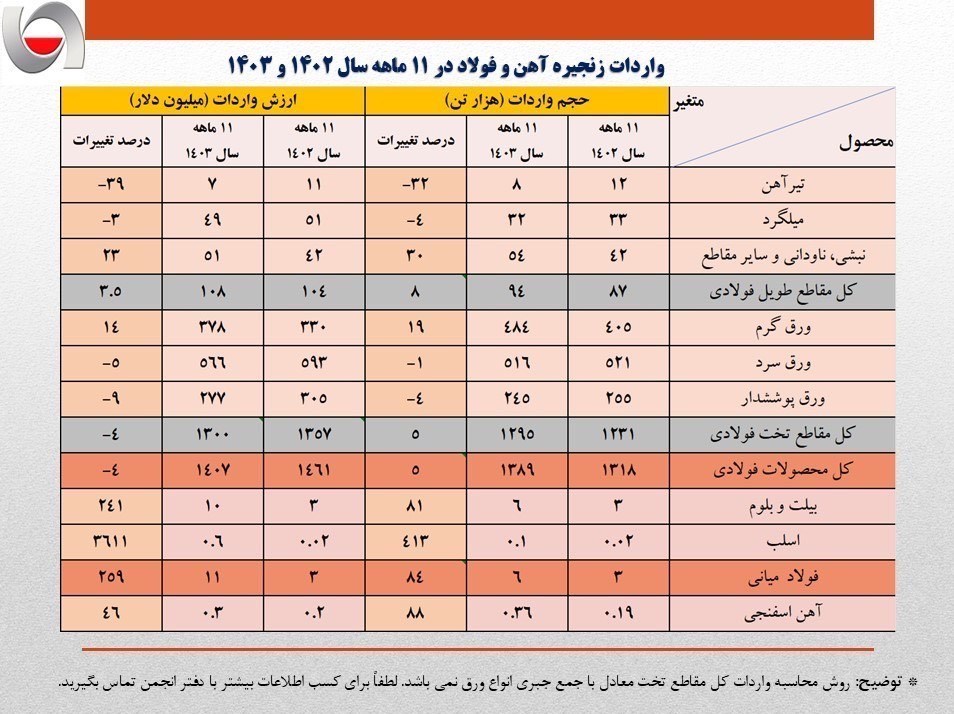 به گزارش خبرگزاری تسنیم، براساس آمار واردات زنجیره فولاد کشور در ۱۱ ماهه سال ۱۴۰۳ بیش از ۱.۴ میلیارد دلار بوده است که معادل کل صادرات میلگرد کشور است.